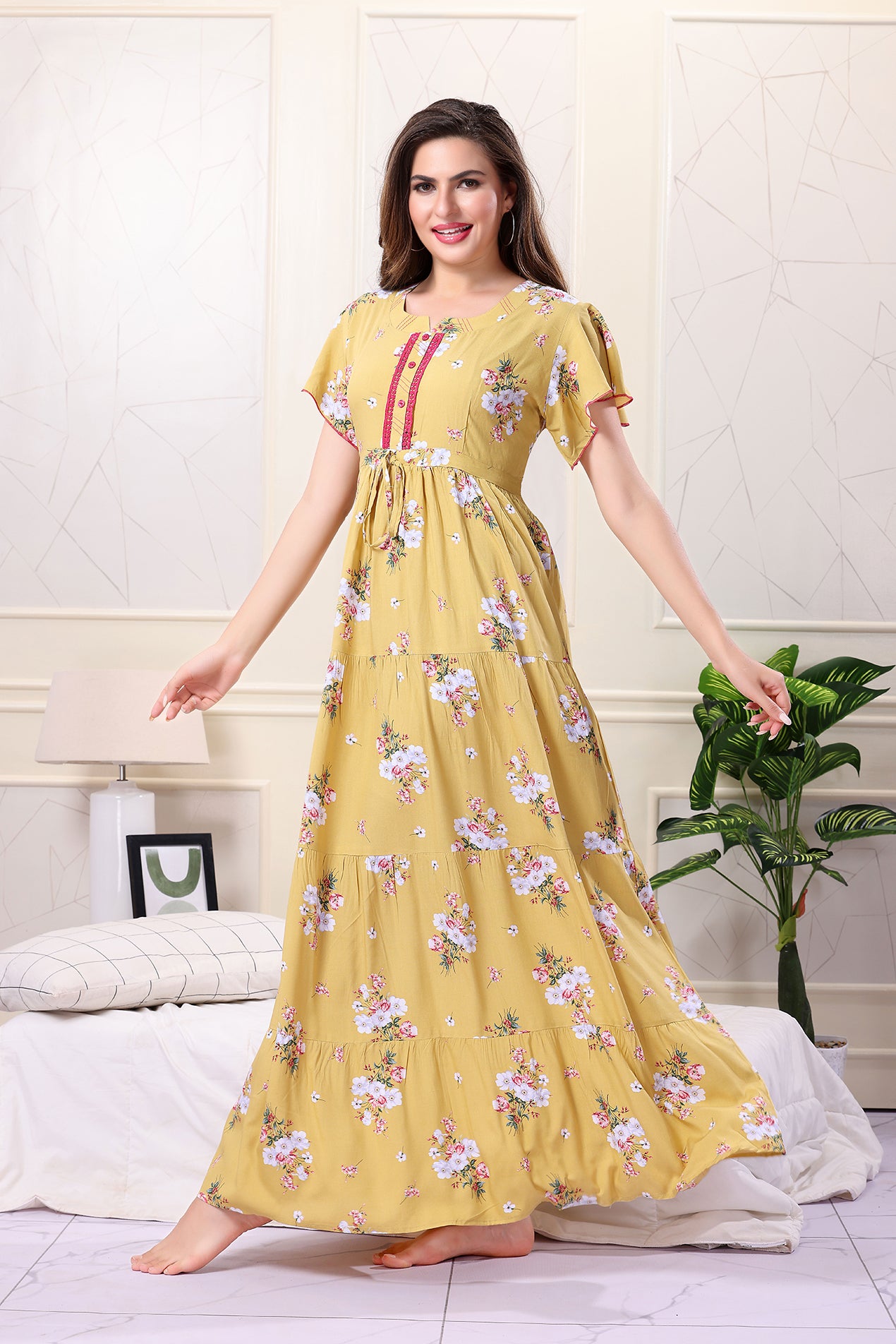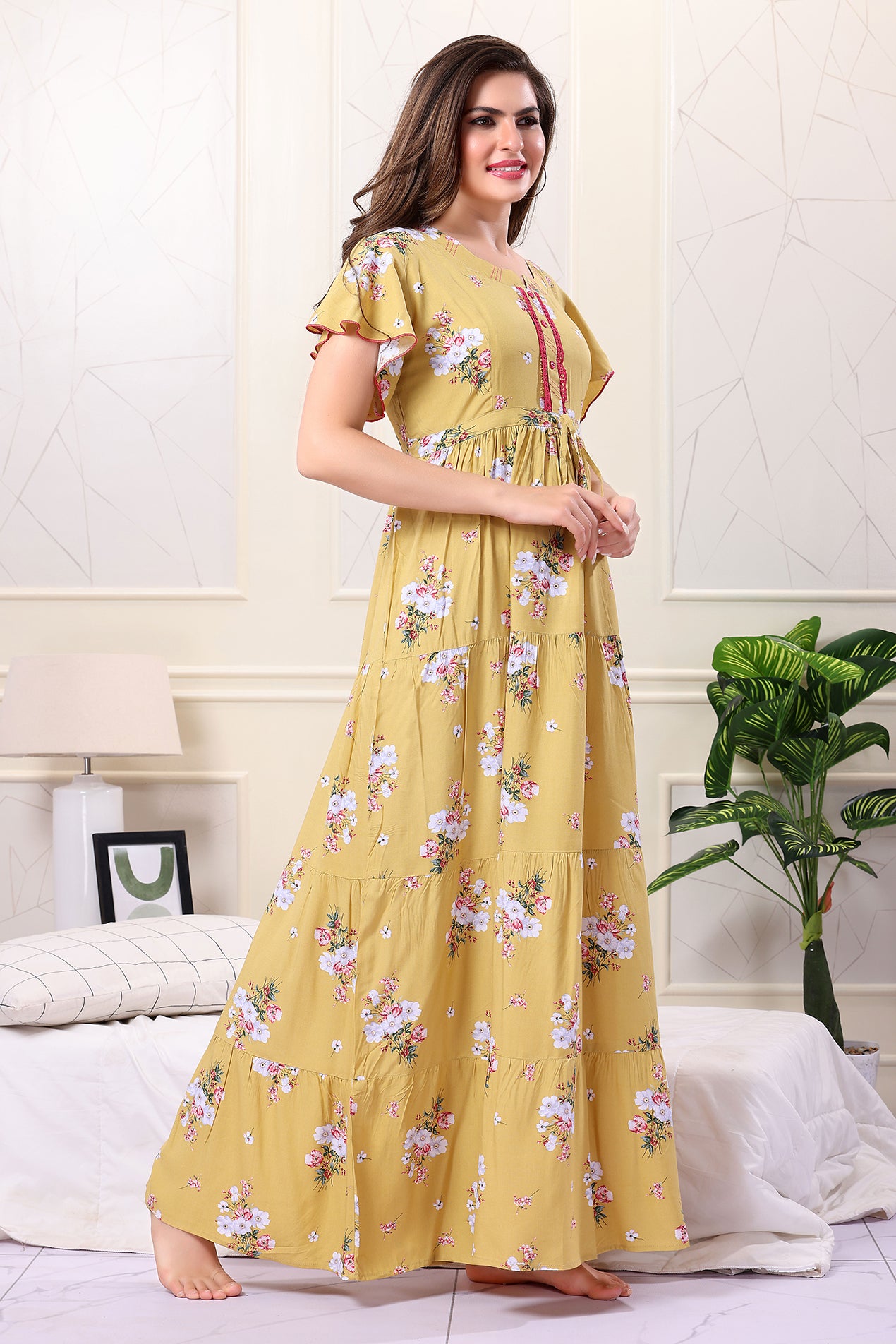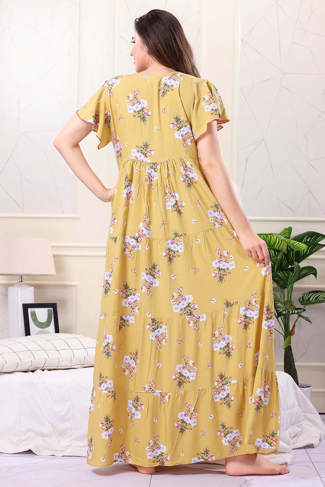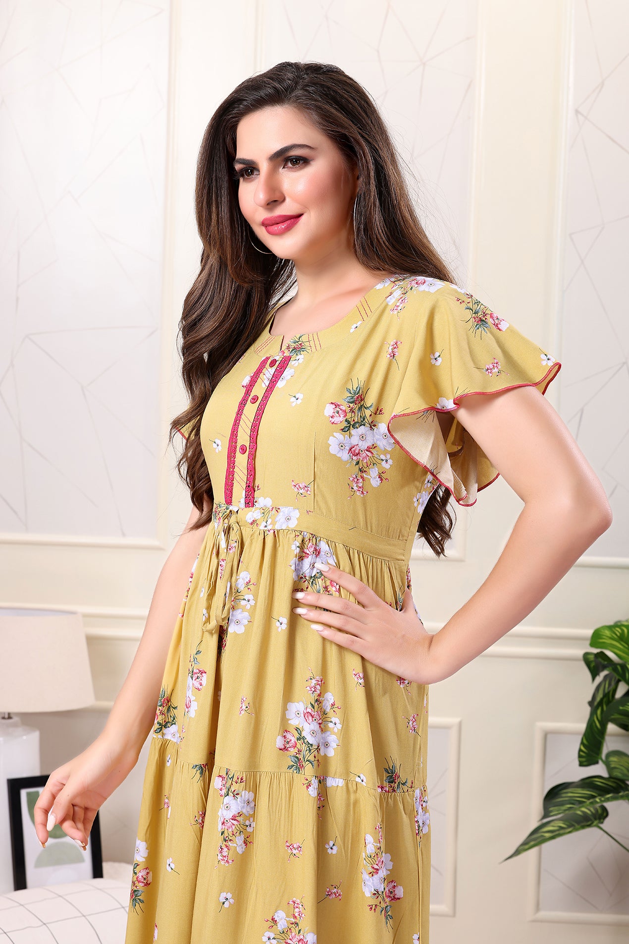 Floral Frock Yellow Rayon Cotton Nighty | Butterfly sleeves