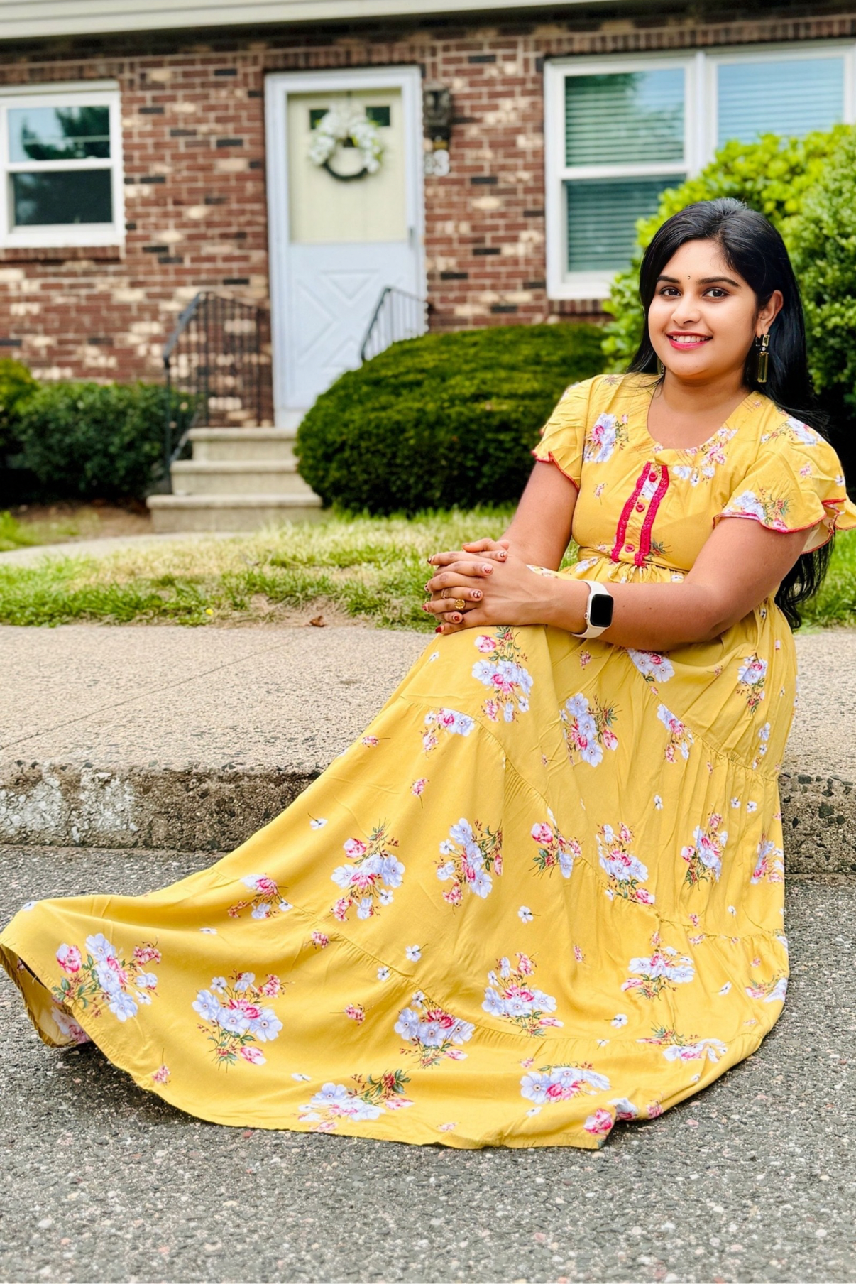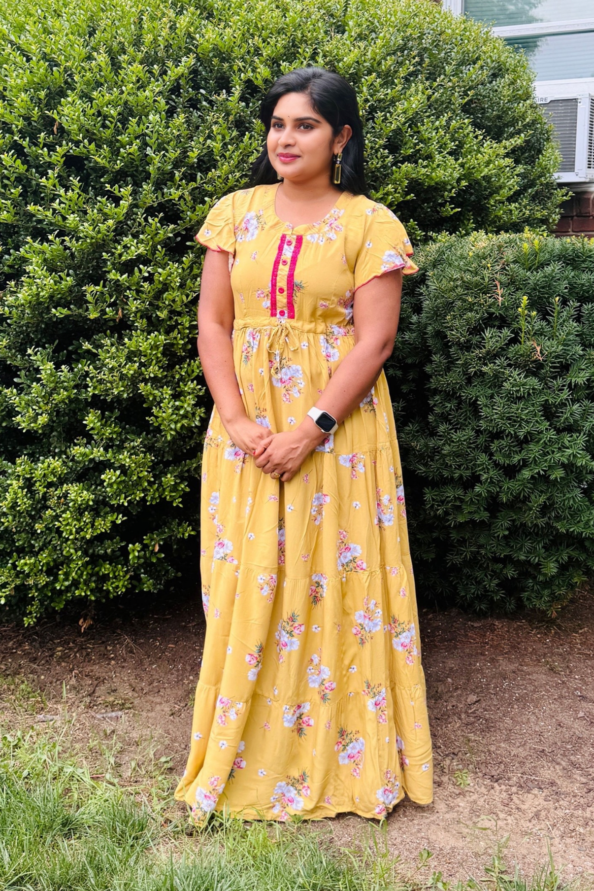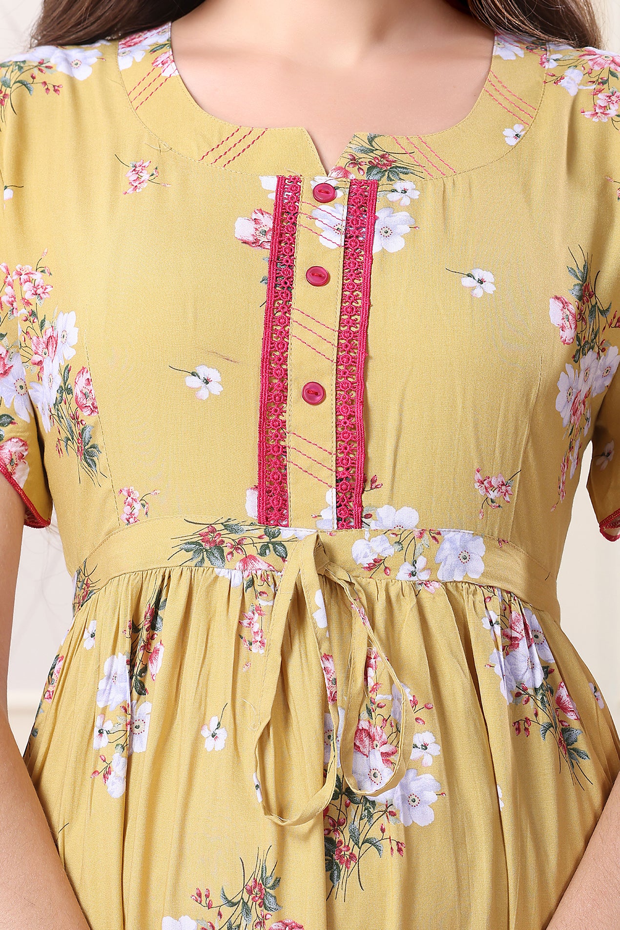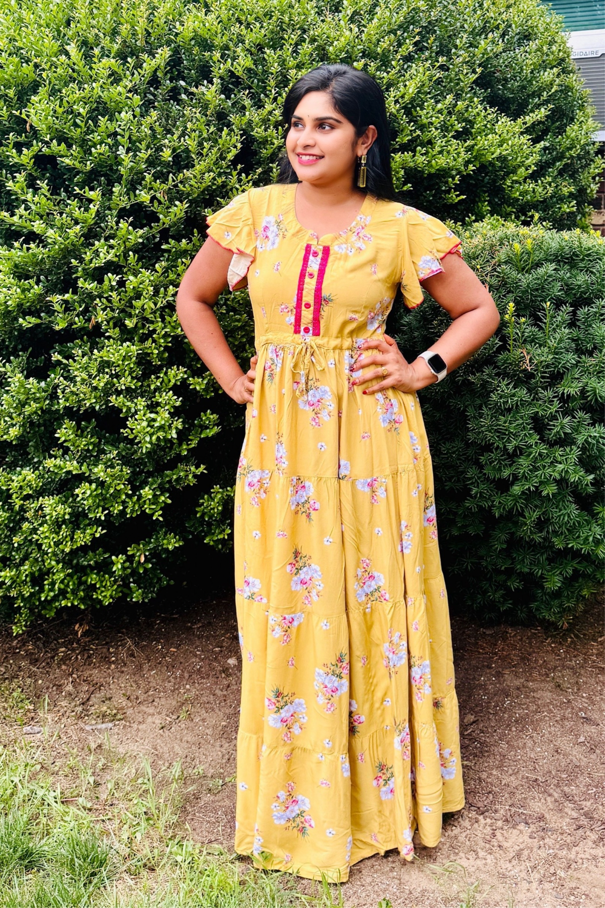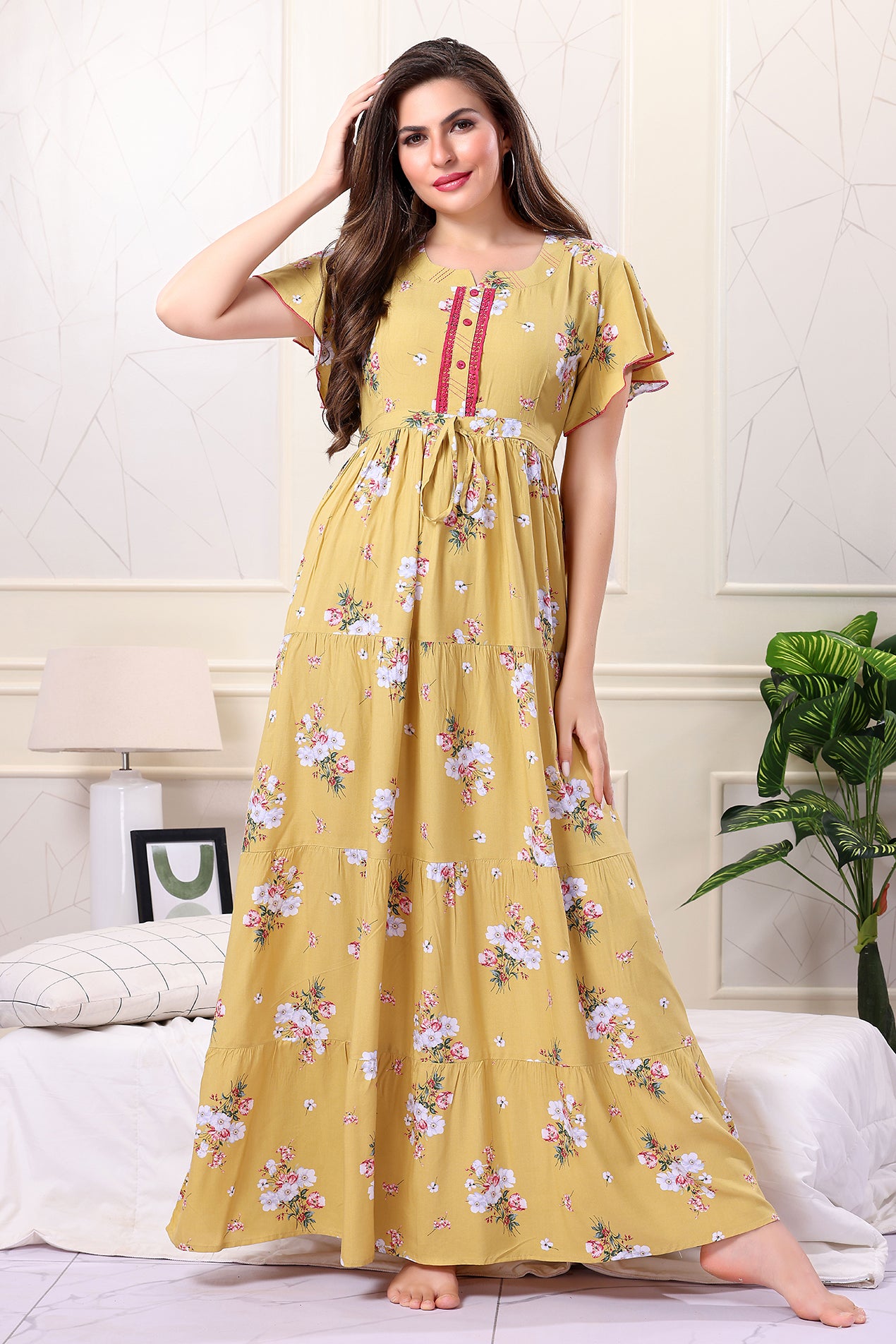 Floral Frock Yellow Rayon Cotton Nighty | Butterfly sleeves